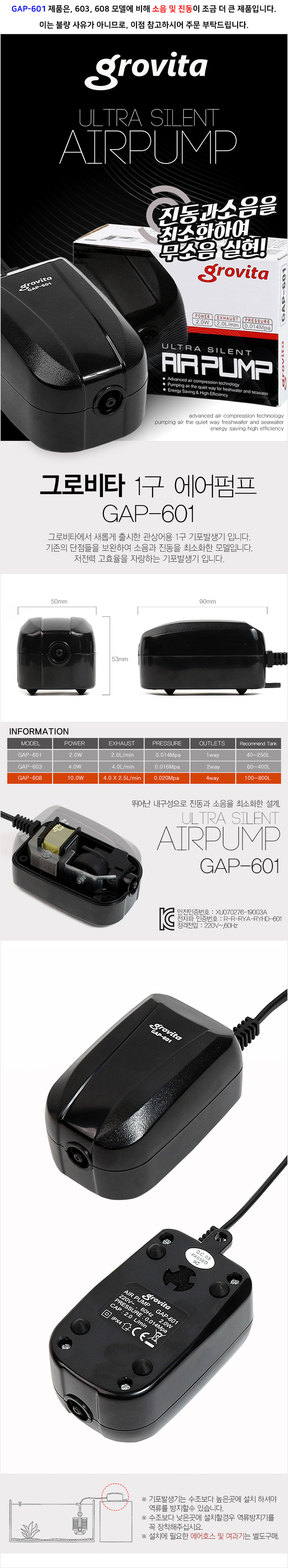 [에어호스2M포함] 그로비타 1구 에어펌프 GAP-601 기포발생기 산소 기포기 5,570원 / 배송비 : 3,000원 주문시결제(선결제)