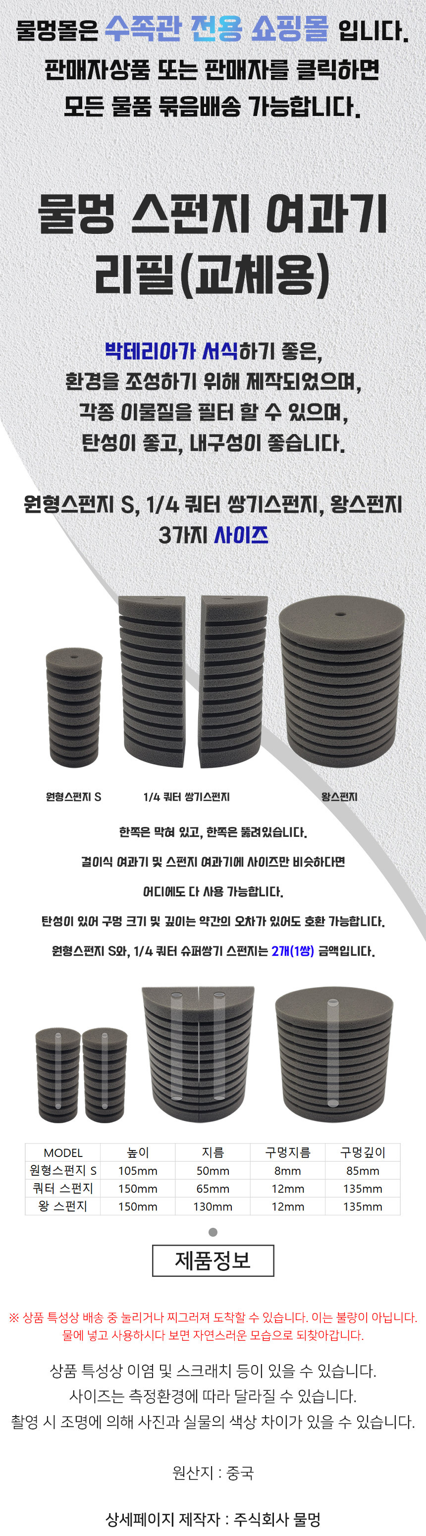 원형 스펀지 여과기 리필 필터 1쌍(2개입) 쌍기용 1,870원 / 배송비 : 3,000원 주문시결제(선결제)